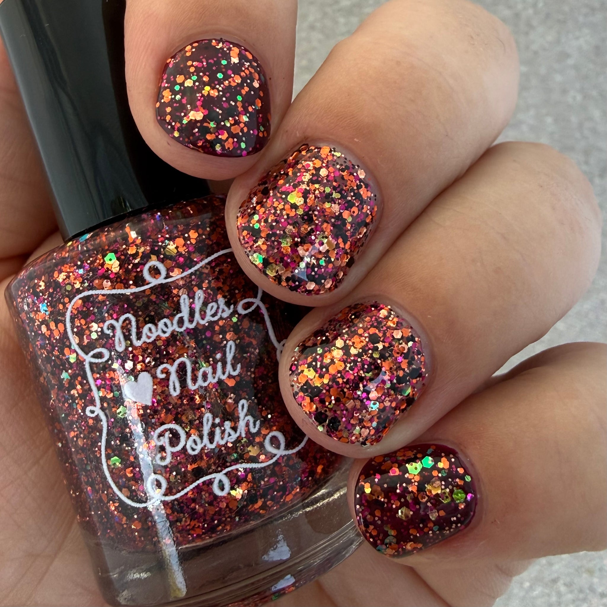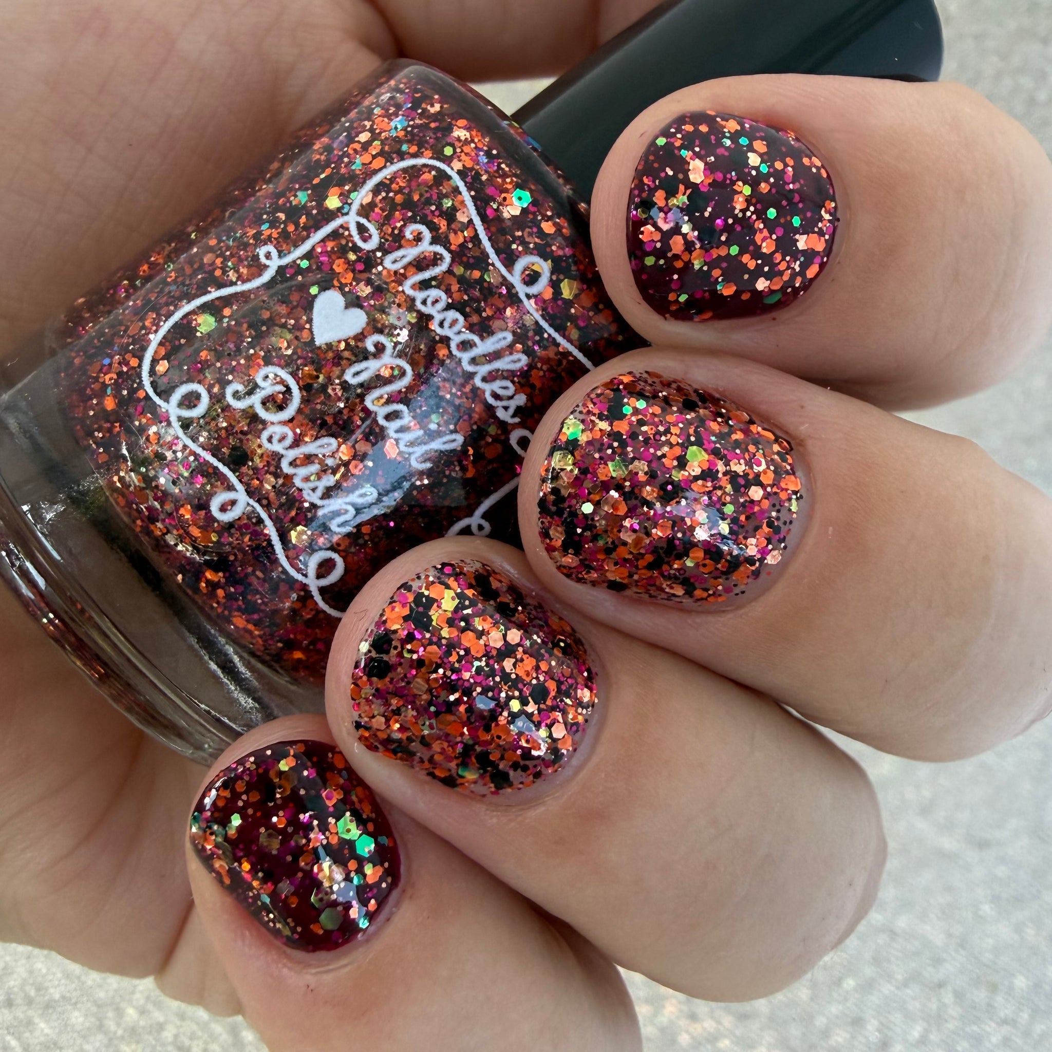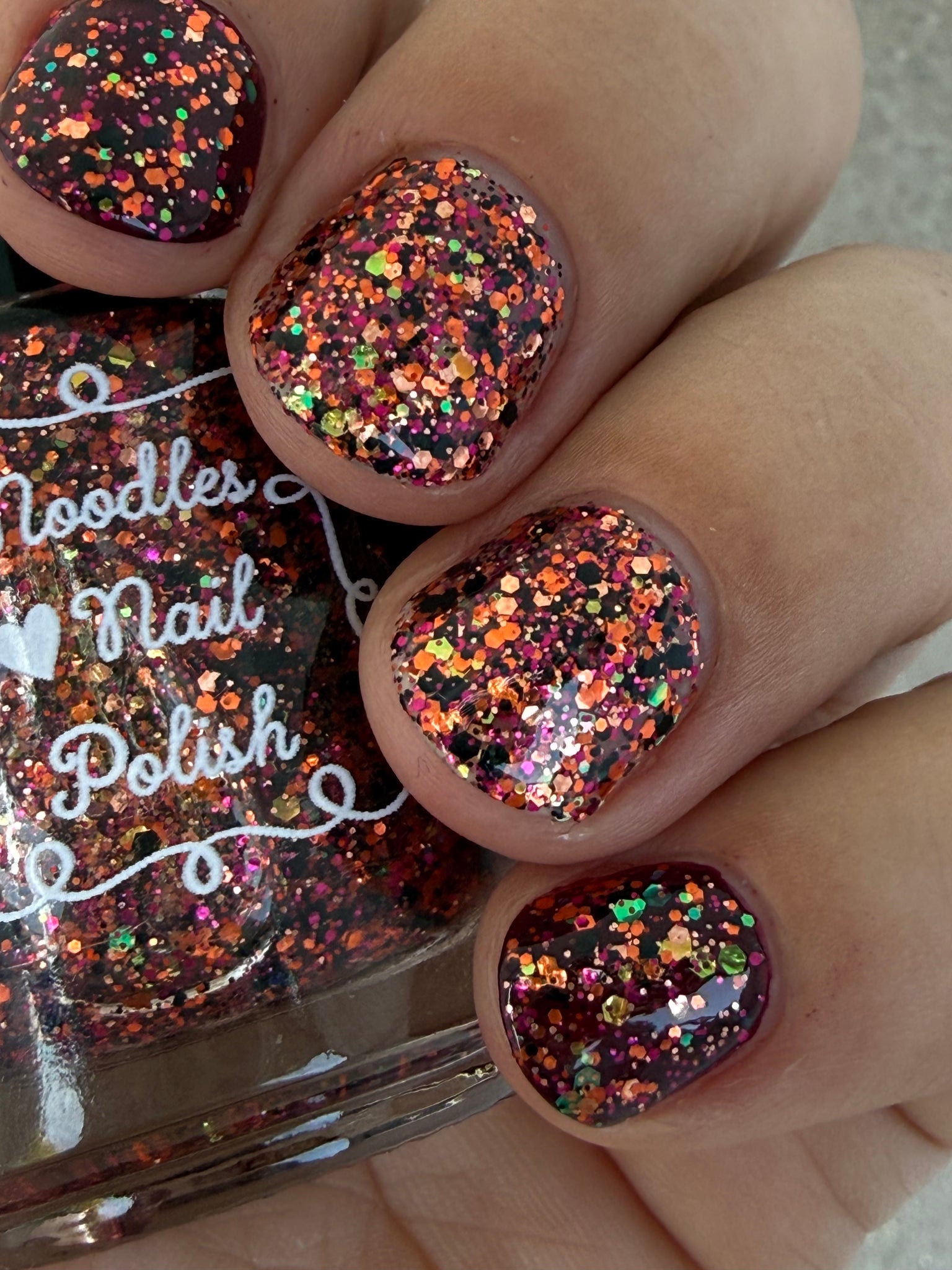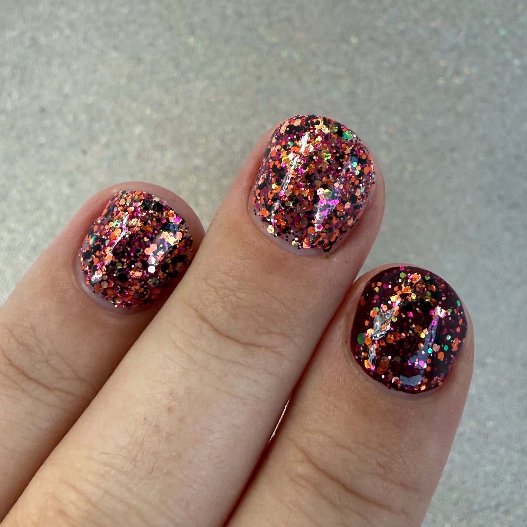 “Witchin’” is a clear based glitter topper with black, orange, copper, raspberry, and lime/gold iridescent glitters. Shown as two coats + glitter grabber + topcoat on ring and middle fingers, one coat over a creme on index and pinky finger.