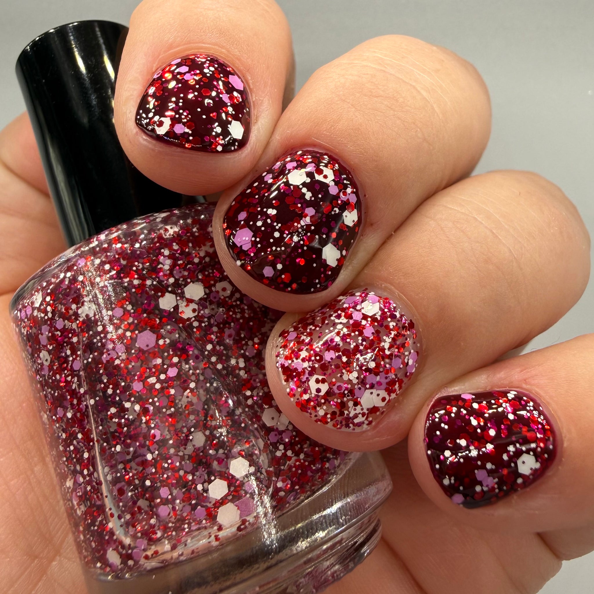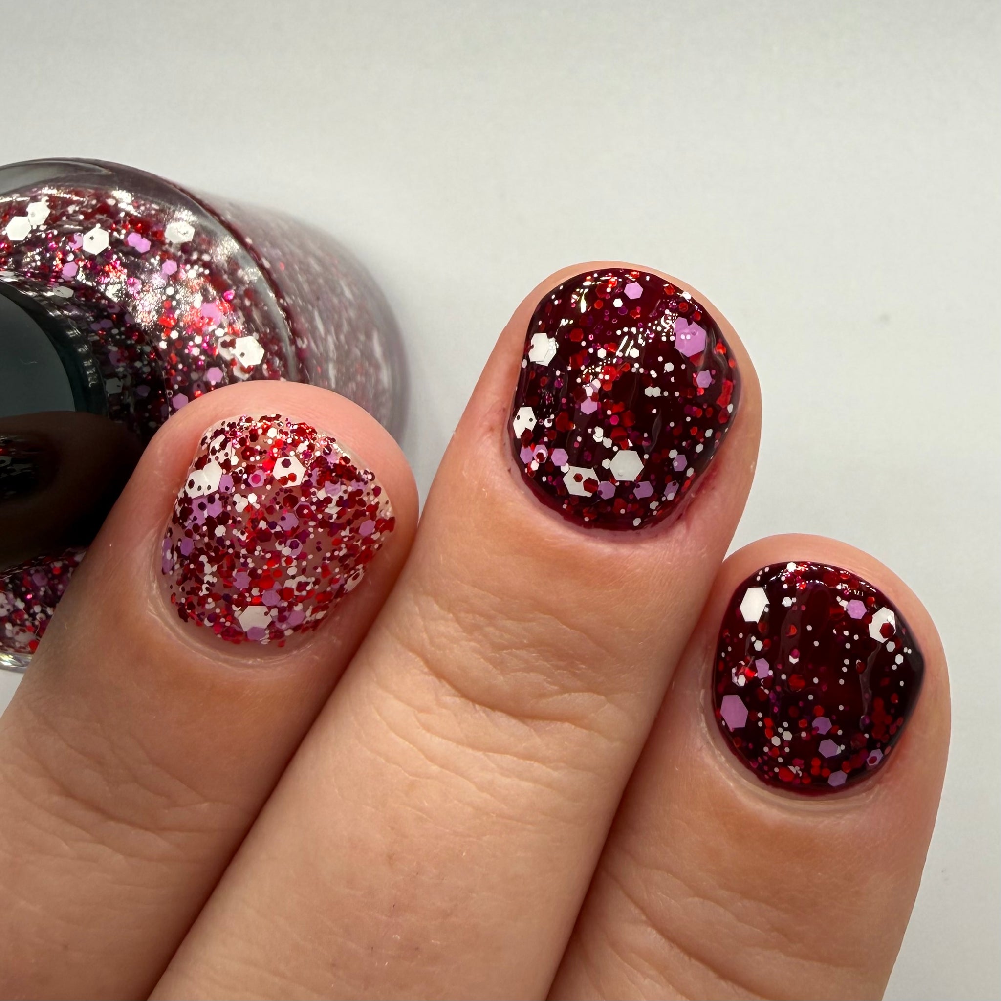 Candy Cane Twist: A clear based topper with white, red, light purple, and fuchsia glitters. Shown as 1 coat over a maroon base and 3 coats on ring finger plus 1 coat glitter smoother and 1 coat topcoat.