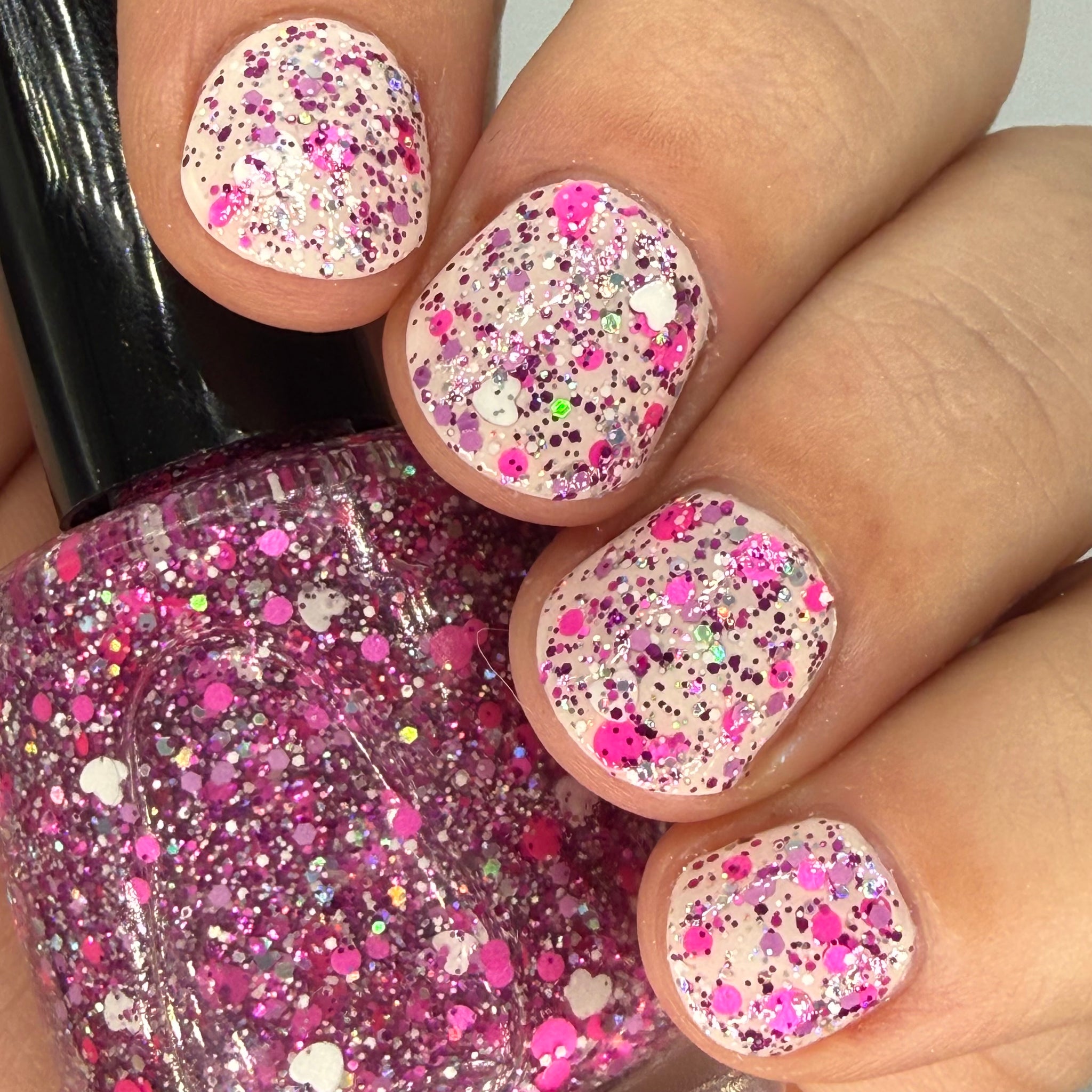 A clear based topper with white, silver, neon pink, fuchsia, and purple glitters and white mini heart glitters.