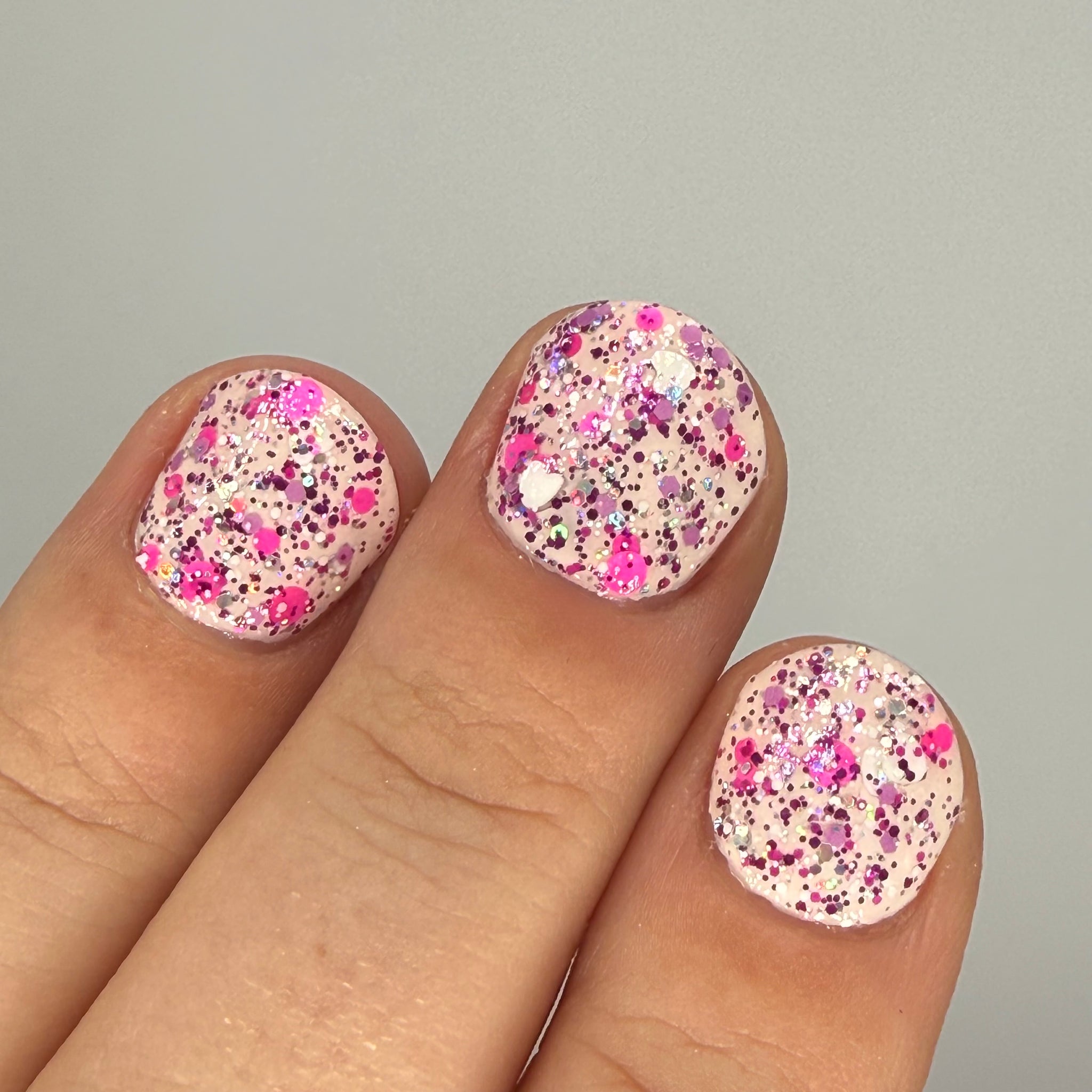 Shown as 2 coats over a pale pink base with 1 coat glitter smoother and 1 coat topcoat.